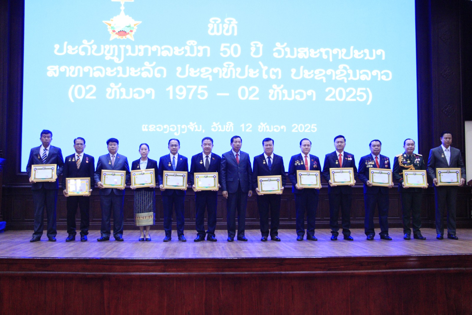 ຫຼັງຈາກນັ້ນ, ໃນພິທີຄັ້ງນີ້ ຍັງໄດ້ມີການປະດັບຫຼຽນກາລະນຶກ 50 ປີ ວັນສະຖາປະນາ ສປປລ ລາວ